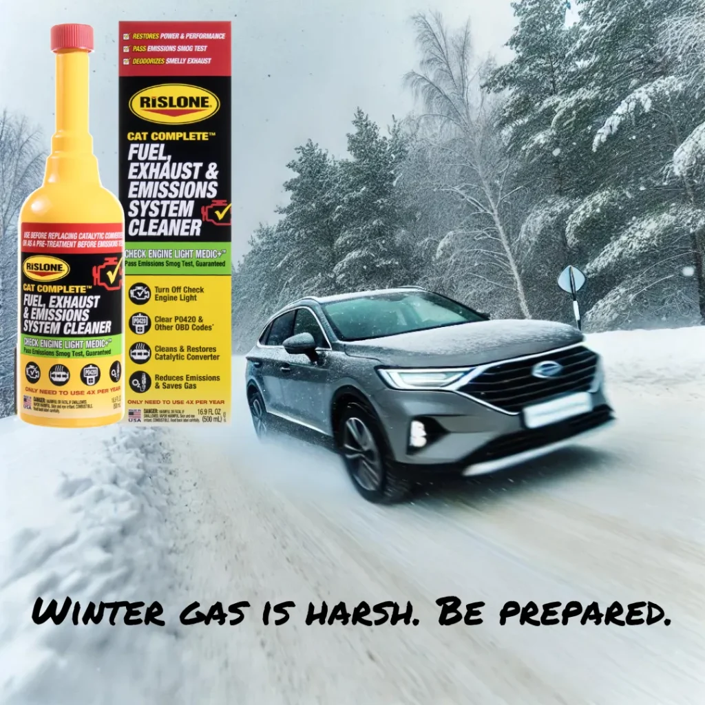 One product that can help with this is our bestselling Rislone Cat Complete™ Fuel, Exhaust & Emissions System Cleaner. This all-in-one cleaner removes harmful deposits from your fuel system, exhaust, and emissions components, improving fuel efficiency and performance. Using it before winter gas takes full effect can help optimize fuel combustion and prevent buildup that’s common with winter gas. With Rislone Cat Complete™, you can enter the winter season knowing your engine is ready to tackle the road, no matter the weather.