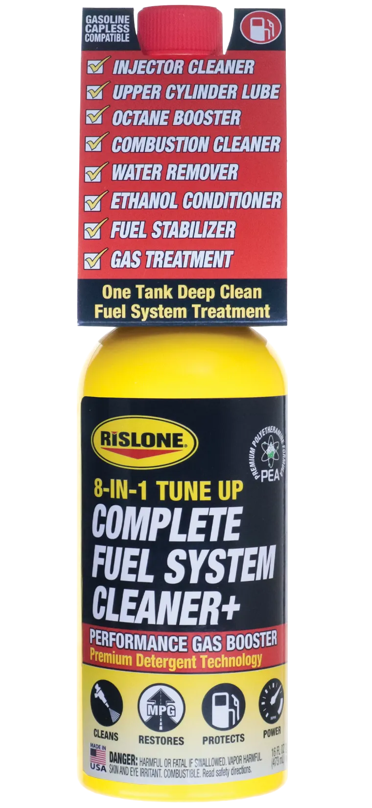 Rislone 8-in-1 Tune Up Complete Fuel System Cleaner+ improves the quality of gas by increasing its cleaning ability, adding lubrication, removing contaminants, reducing spark knock, and heling to prevent the fuel from going bad. This one bottle contains the same amount of additives equal to a bottle of regular injector & complete fuel system cleaner, upper cylinder lubricant, fuel stabilizer & conditioner, dry gas, gas treatment and octane booster. Simply put, it is the best all in one gasoline fuel additive money can buy.